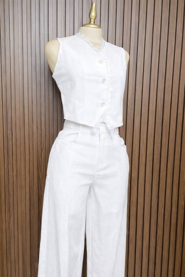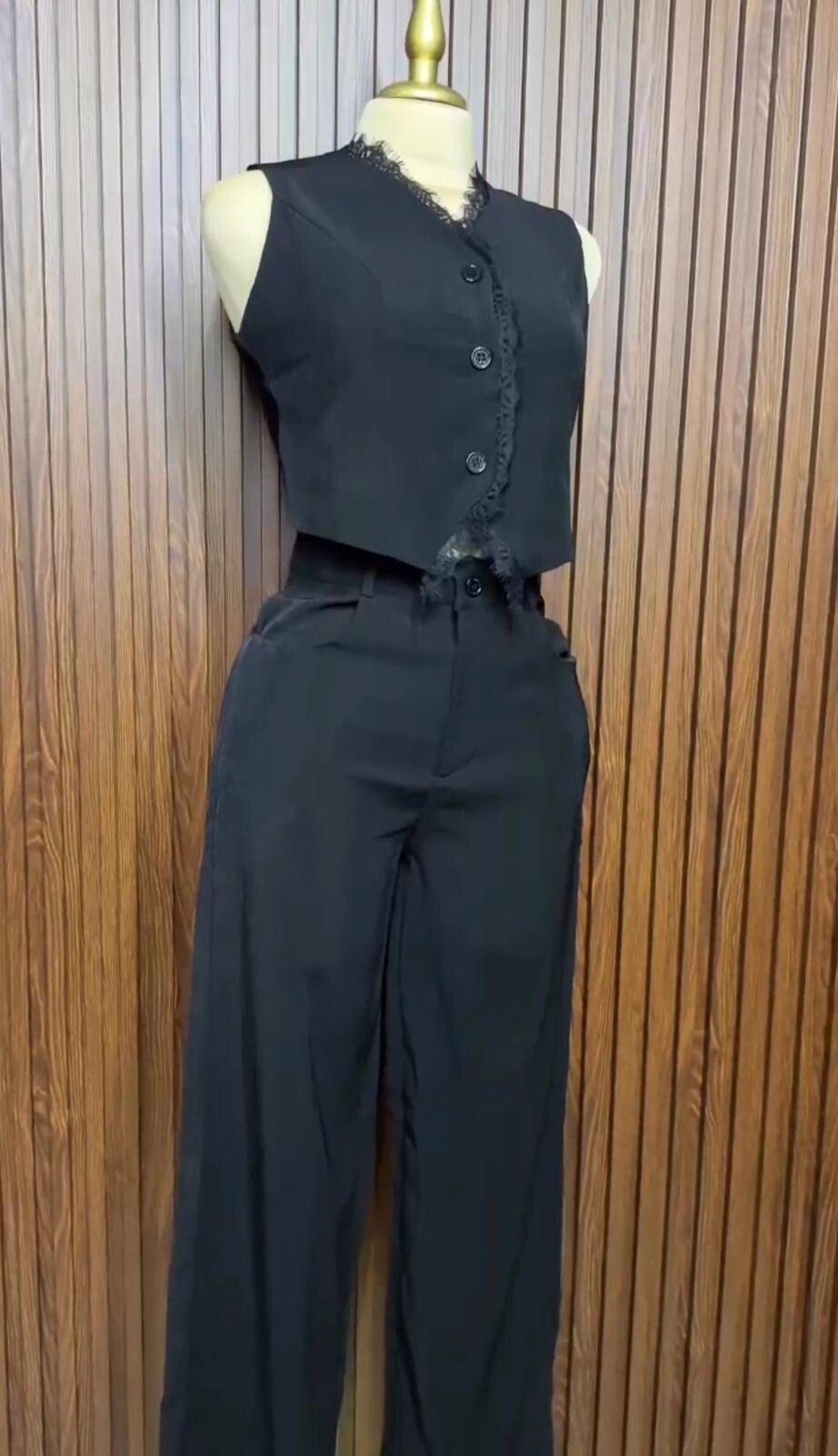 Conjunto de chaleco con detalle de encaje + çpantalón de corte recto amplio.